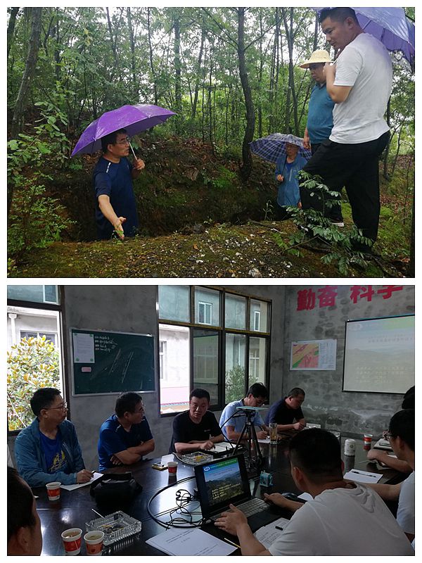 到達項目部后,李靠社一行聽取了項目負責人對項目工作進展及找礦成果的匯報,冒雨前往野外對重要地質路線及重點見礦探槽進行了檢查,并與項目技術人員進行了現場交流。在項目部,檢查組對地質填圖、剖面及探槽原始資料進行了詳細查閱,對項目取得的成果表示肯定,同時針對資料中存在的問題與技術人員進行了探討與交流,并提出了意見及建議,一是編繪全區鉆孔柱狀圖,確定含錳地層層序;二是分析含錳巖系沉積相特征、沉積環境特征,確定找礦標志,為工程揭露工作提供依據;三是對原始資料存在的問題及時整改,加強綜合整理,及時對已有資料進行總結歸納;四是對項目資料中存在的問題進行深刻剖析,并加強地質基礎資料整理與研究;五是加強與武警黃金支隊項目交流,促進項目找礦工作。