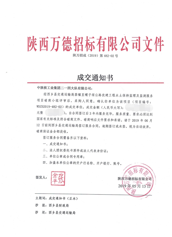 為進一步拓展公司業務,公司水工環院緊跟市場導向,緊抓市場機遇,在4月26日陜西省政府采購網發布了西鄉縣交通運輸局茶鎮至碾子埡公路改建工程水土保持監理及監測服務項目招標公告后,公司水工環院高度重視,積極組織人員進行標書編寫,項目人員五一節假日加班加點、團結協作、共同努力,高效率、高質量完成了編制投標文件的任務,并在5月10日進行的競爭性磋商中,經嚴格的專家評審,采購人“成交復函”確認,以優秀的方案、完善的服務標準脫穎而出,成功中標。隨后,水工環院將積極簽訂合同,并根據合同任務進行項目的安排、部署,做好下一步的實施工作。
