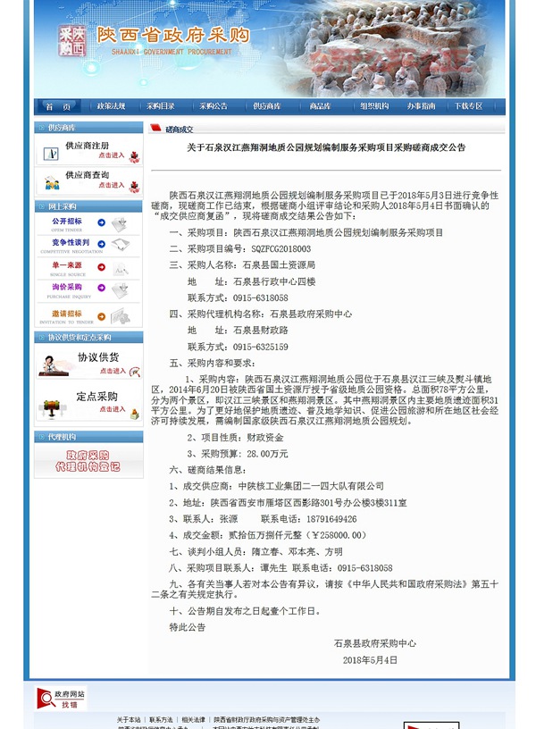 2018年5月3日,石泉縣政府采購中心按照政府采購程序,公告了“陜西石泉漢江燕翔洞地質公園規(guī)劃編制”項目競爭性磋商采購結果,公司項目標書內容詳實,經磋商小組專家評審,在符合資格條件、有能力提供項目所需服務的眾多供應商中脫穎而出,成功中標。