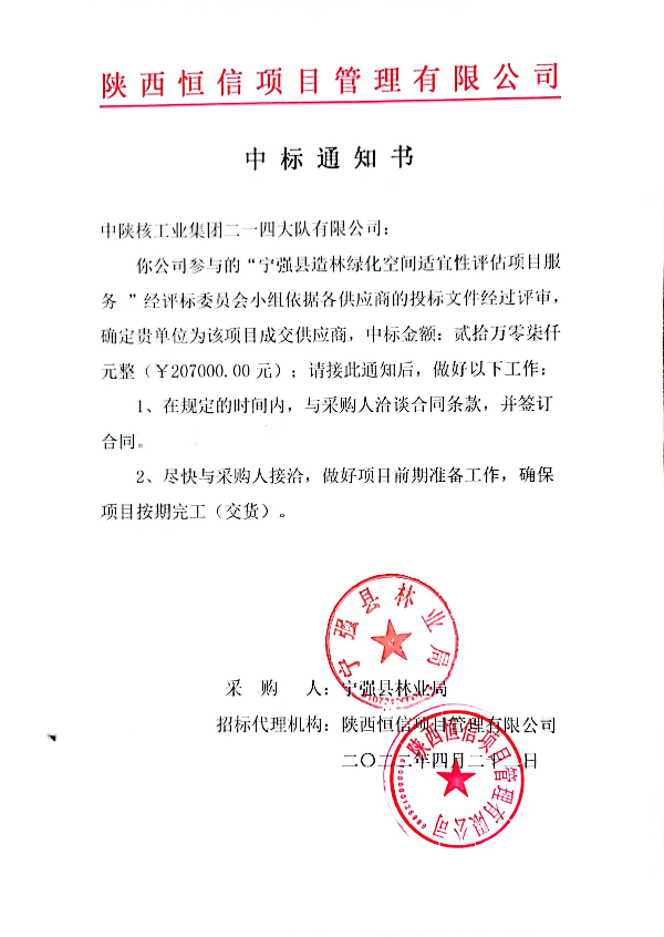 近日,接招標(biāo)代理機(jī)構(gòu)成交通知書,公司成功中標(biāo)《寧強(qiáng)縣造林綠化空間適宜性評(píng)估項(xiàng)目》。